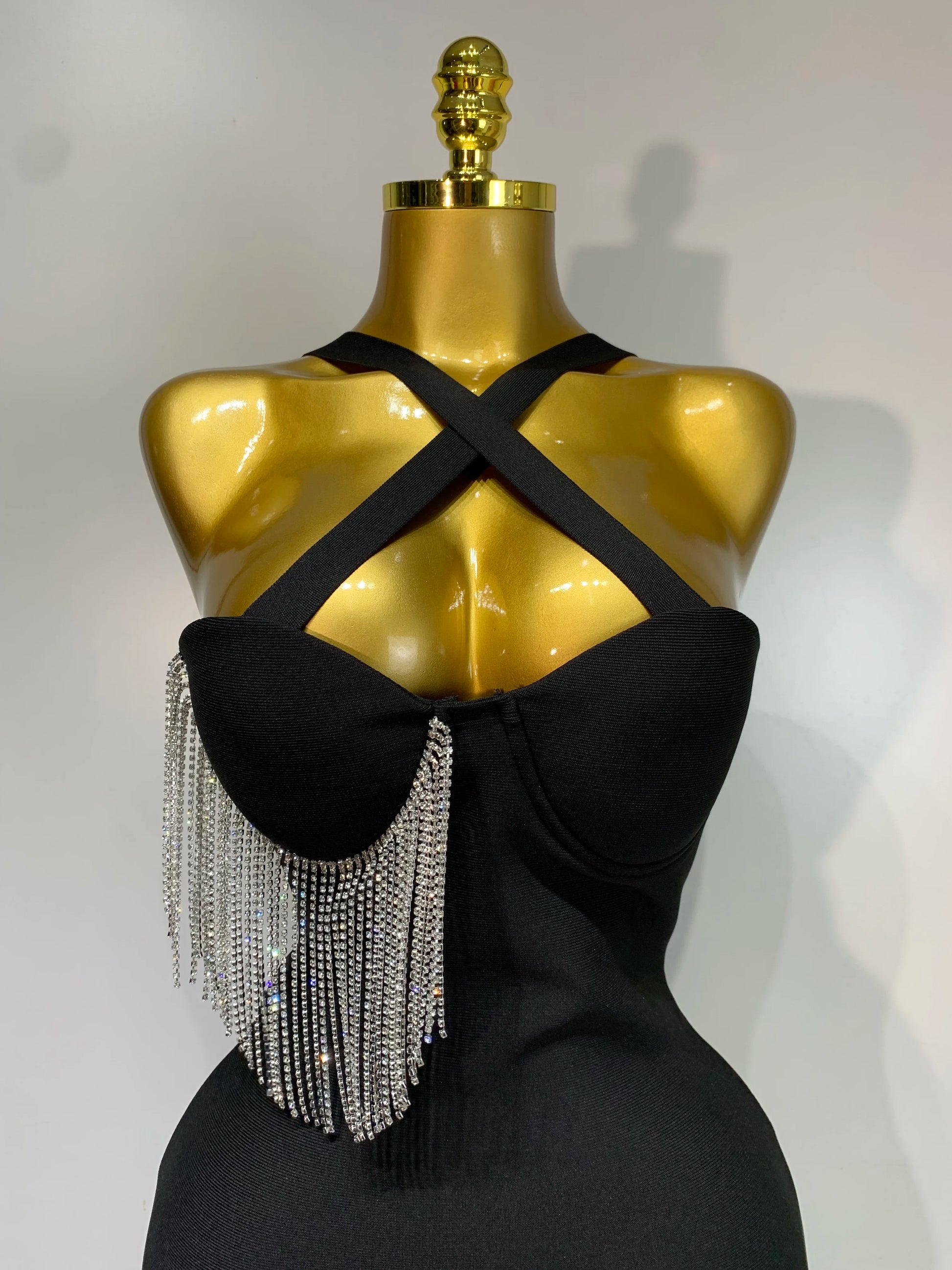 Women Sexy Diamonds Tassel Crystal Midi Black Bodycon Bandage Dress 2025 Elegant Evening Party Luxury Birthday Dresses Vestido